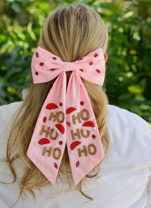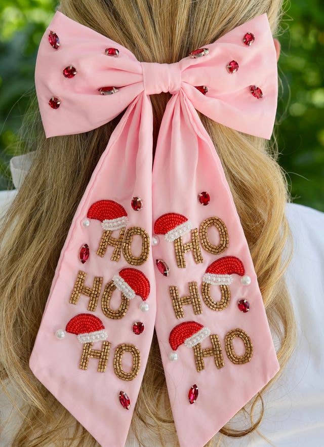 Be ready for Santa's arrival with this festive hair bow! It has 'HO HO HO' in gold beading with accent beaded Santa hats as well. It is also embellished with rhinestone accents for added fun.