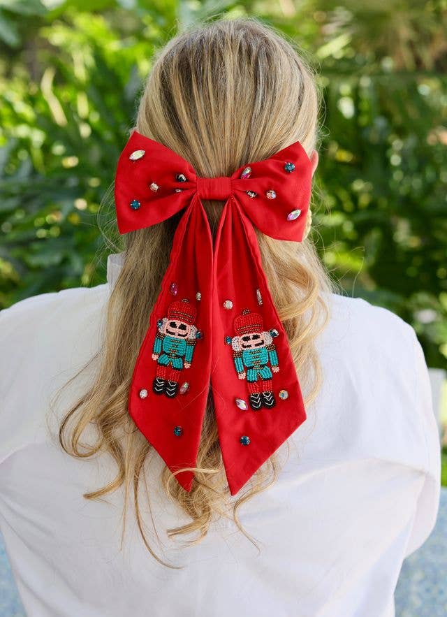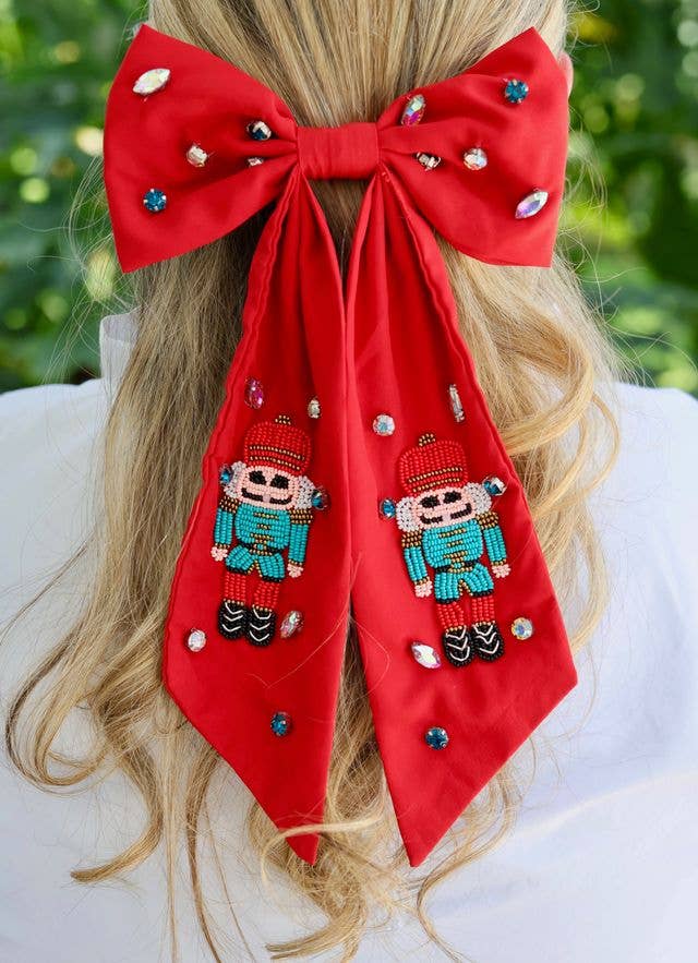 Be Christmas season ready with this festive hair bow. It features beaded nutcrackers and is embellished with accent rhinestones. Perfect for holiday parties or going to the Nutcracker ballet!